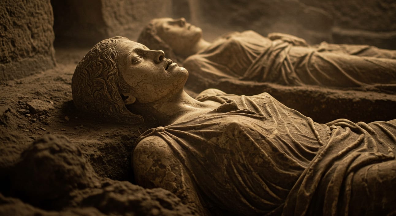 Pompeii had been completely buried when Mount Vesuvius erupted in 79 AD. The eruption covered the city in ash and volcanic rock, killing thousands of residents who couldn't escape in time. But this disaster also preserved the city almost perfectly - like a snapshot of everyday Roman life frozen in time. The ash covered everything so quickly that daily activities were captured just as they were happening, but of course, some moments were darker than others.