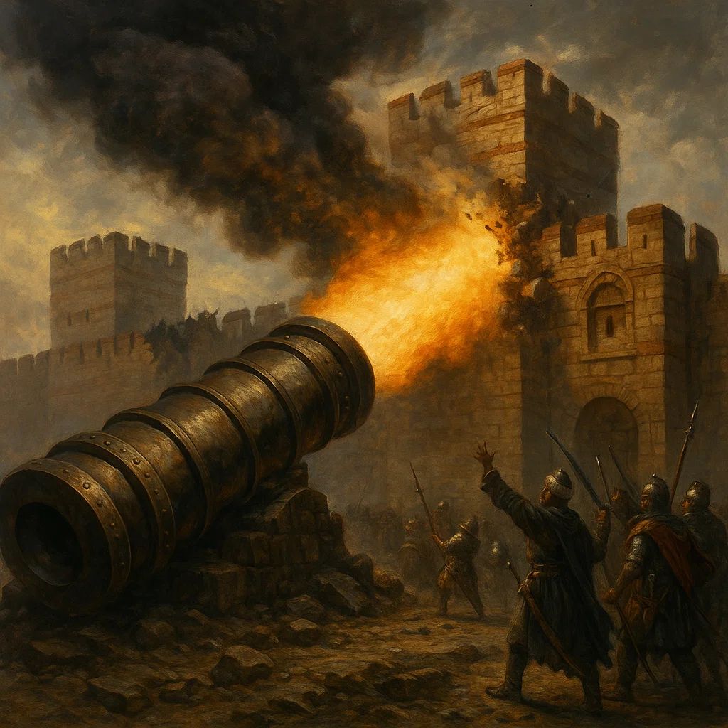 The Byzantines, led by Emperor Constantine XI, were vastly outnumbered. They had maybe 7,000 defenders behind their ancient walls, facing a massive Ottoman army estimated at 80,000 to 100,000 men. Mehmed brought with him a secret weapon — a giant cannon, known as the Basilica, capable of smashing through walls that had stood for centuries. For weeks, the Ottomans hammered the city with artillery, blockaded the harbor, and slowly closed in.