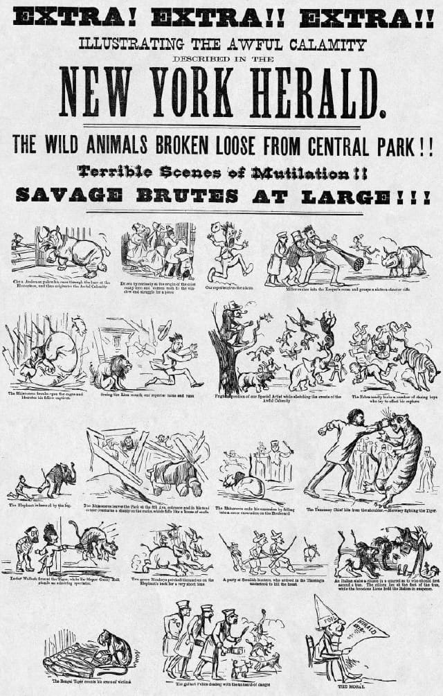 In 1874, the New York Herald published a shocking front-page story claiming that animals had escaped from the Central Park Zoo, including lions, tigers, and a rhinoceros on the loose in Manhattan — with dozens of people supposedly killed or injured. Panic spread fast as readers scrambled to avoid the imaginary beasts roaming the streets. But at the very end of the article, in fine print, the paper admitted it was all a hoax — a fabricated tale meant to raise awareness about poor zoo safety. The stunt worked a little too well, sparking public outrage and cementing the “Great Zoo Escape” as one of the wildest examples of fake news in American history. 🦁🗞️