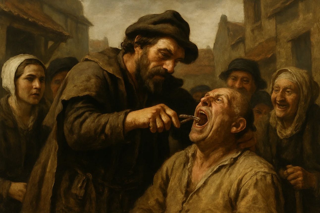 Before modern dentistry made things (mostly) painless, getting a tooth pulled was less of a private medical procedure and more of a public spectacle — complete with crowds, shouting, and sometimes music. In 18th and 19th century Europe, especially at markets and fairs, “tooth-drawers” would set up shop right on the street. They’d yank teeth from screaming patients while an assistant played music or cracked jokes to distract the crowd. Some even had costumes and banners — because nothing says "fun day out" like watching someone lose a molar. People gathered not just to get help, but to watch, laugh, cringe, and cheer. It was medicine meets theater, and if you were lucky, you left with one less tooth and a good story.🦷🎻👀